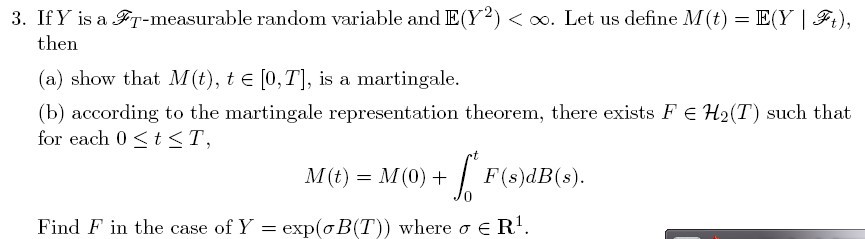 Part b). E(exp(\sigmaB(T)|Ft)=exp(\sigma B(t)) exp(B(T)-B(t)|F_t)=exp(\sigma B(t)) exp(B(T)-B(t)) since the second part is independent of F_t.
