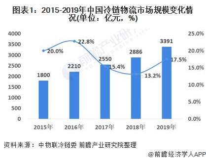 根据中物联冷链委公布资料显示,2015-2019年,中国冷链物流市场规模持续扩大,年均复合增长率为17%,2019年冷链物流行业的市场规模达到3391亿元,同比增长17.5%。