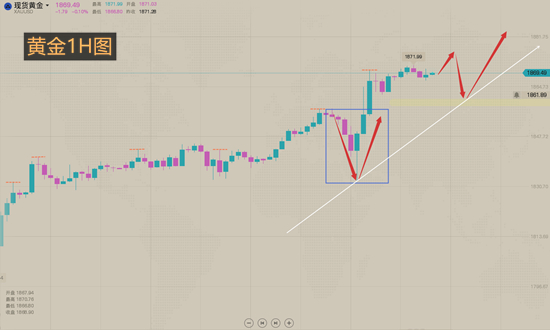 黄金昨日剧烈震荡,最终突破拉升,脱离底部盘整,明确的信号,清晰的走势,底部区域多空频换转换,但是趋势来临,操作就变得简单,低多看涨即可。当前黄金短线支撑是1868位置,欧盘如回落此区域还可以继续多。上方目标是1880-90区域。