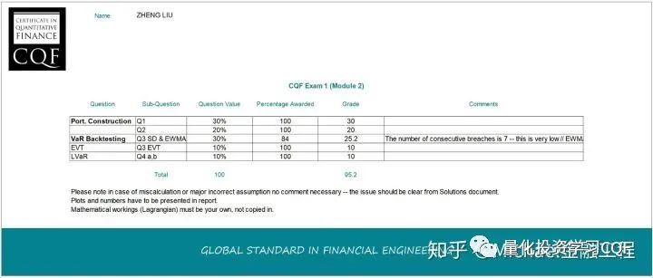 考试心得CQF的考试注重理论联系实际的能力,从考试的形式和最后的评分,考试要求大家能运用课程的内容结合实际的数据进行分析,培养考生将理论和实际相结合的能力。