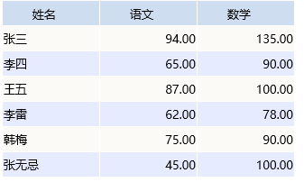 多柱图的制作过程与单柱图是一样的。首先,准备数据集,包含“姓名”、“语文成绩”和“数学成绩”,如下: