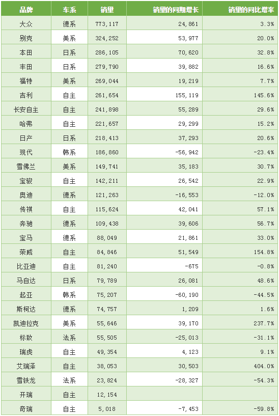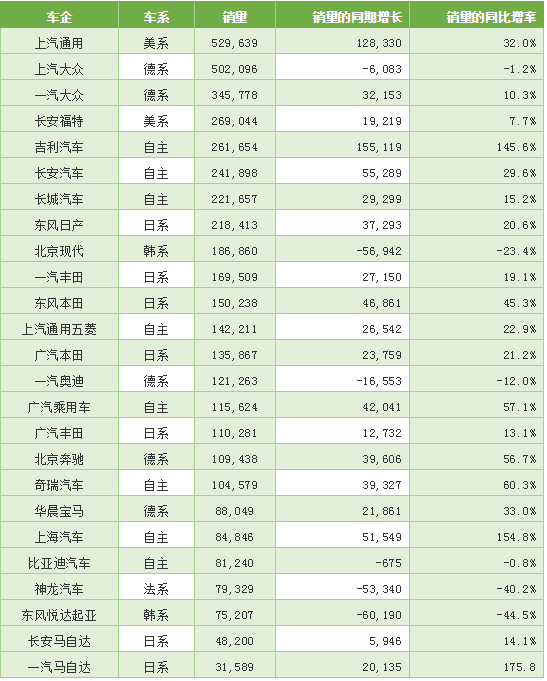 快速增长的汽车消费需求,刺激了车企们的相互竞争,我们先看看主力企业们的表现:(以销量降序)