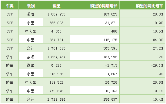 从热销车型统计来看,国内市场汽车销售仍处于较快发展,其中SUV总体销量同比增长27.2%,轿车总体销量同比增长10.4%。