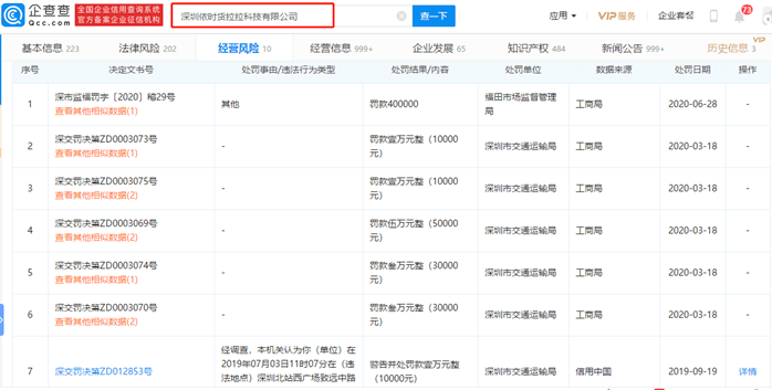 其中,2020年6月28日,深圳市市场监督管理局福田局对货拉拉罚款40万元,处罚依据为,货拉拉平台违反电子商务法相关规定,包括修改交易规则未在首页显著位置公开征求意见,未按照规定的时间提前公示修改内容,或者阻止平台内经营者退出。