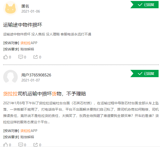 开甲财经注意到,货拉拉业务在快速扩张的同时,服务质量却并未同步跟上。多位网友在黑猫投诉发帖反馈,其通过货拉拉平台运输的物品中途损坏,联系货拉拉平台却得不到理赔。