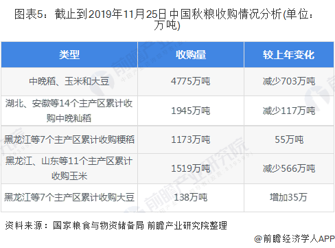 截至2019年11月25日,主产区累计收购中晚稻、玉米和大豆4775万吨,同比减少703万吨。湖北、安徽等14个主产区累计收购中晚籼稻1945万吨,同比减少117万吨。黑龙江等7个主产区累计收购粳稻1173万吨,同比减少55万吨。黑龙江、山东等11个主产区累计收购玉米1519万吨,同比减少566万吨。黑龙江等7个主产区累计收购大豆138万吨,同比增加35万吨。
