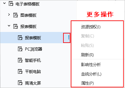 报表模板支持更多操作,点击显示更多操作,包括:资源授权,属性等,如图: