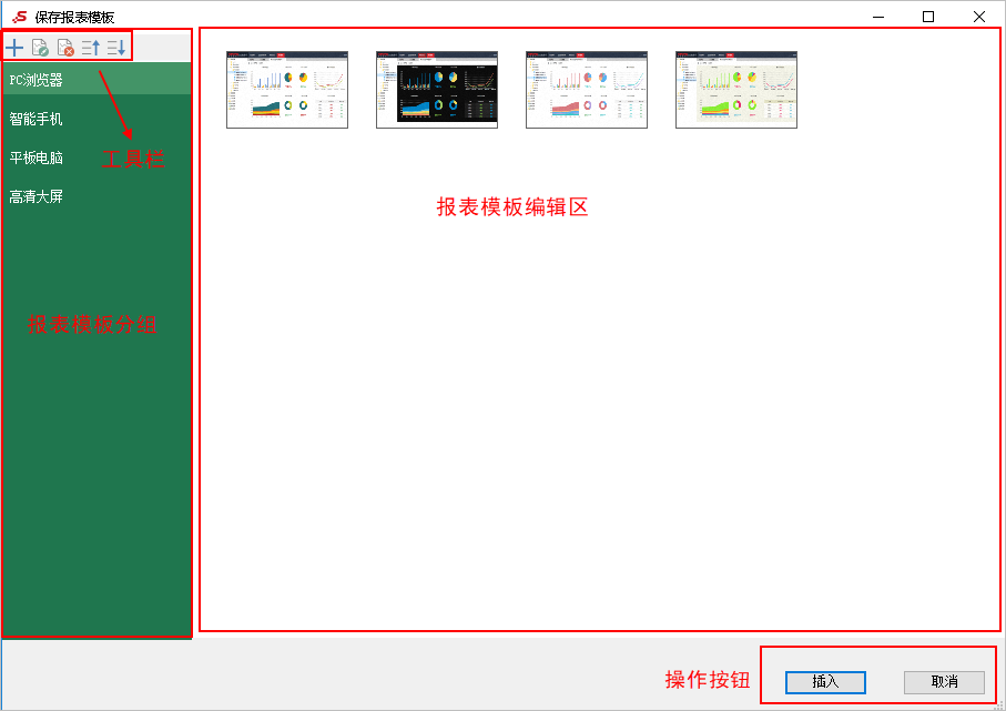 进入“保存报表模板”界面,界面分为三部分:报表模板分组、报表模板编辑区、操作按钮,如图: