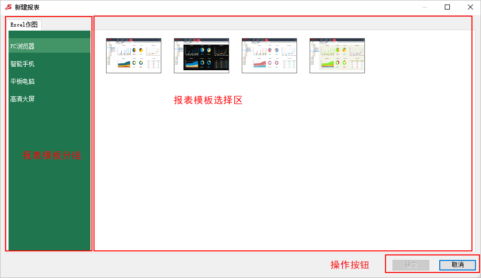 进入“新建报表”界面,界面分为三部分:报表模板分组、报表模板选择区、操作按钮,如图: