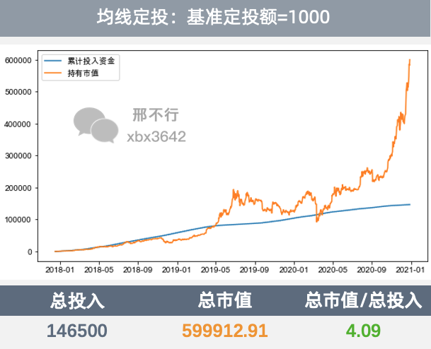 普通定投每次投入1000美金,均线定投的基准金额也为1000美金。