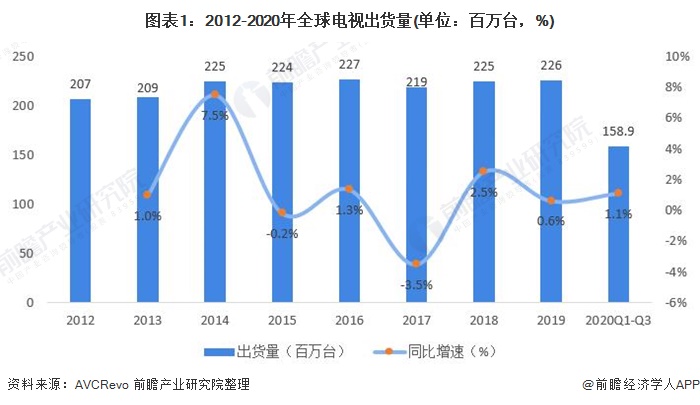 2015年开始,全球电视已经进入存量竞争时代,年均出货量在2.2亿台左右。2020年前三季度,全球电视出货量约为1.59亿台,同比增长1.1%。