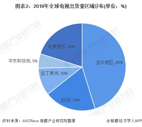 其中,亚太地区是全球电视机出货量最大的地区,2019年亚太地区电视机出货量占比达到45%。北美地区和欧洲排名第二和第三,但是差距不大,2019年占全球电视机出货量的20%和19%;拉丁美洲、中东和非洲电视机出货量占比分别为10%和5%左右。