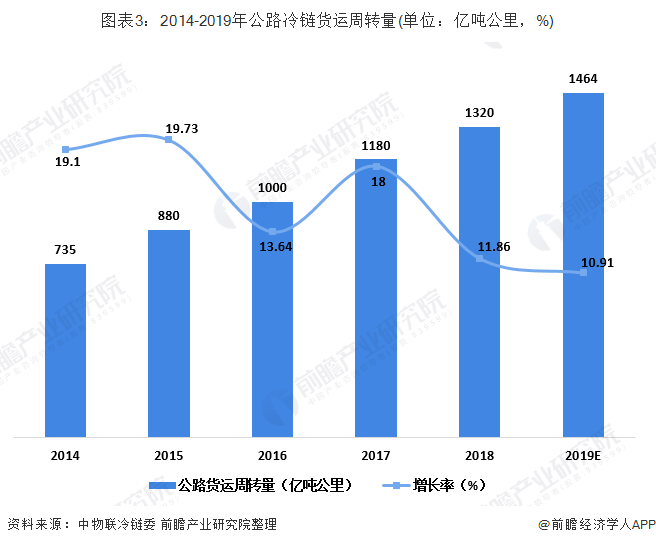 我国有90%的冷链物流货运量由公路冷链运输完成。2018年我国公路冷链货运周转量达到1320亿吨公里,由此可以推算2018年我国冷链货运周转量约为1467亿吨公里,农产品冷链物流的周转量约为1188亿吨公里。