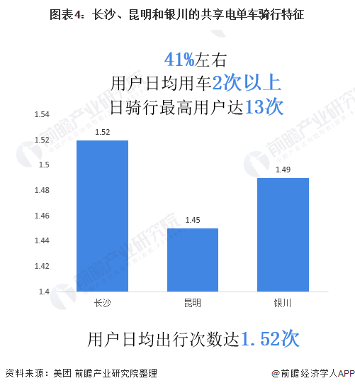 根据200年10月由美团电单车联合武汉市交通发展战略研究院大数据团队联合发布《2020年共享电单车出行观察报告》,此报告以2019年11月至2020年7月间昆明、长沙、银川三座城市的出行大数据为蓝本。在三座样本城市,用户平均单次骑行15分钟,行程2.5公里;骑行时速约10.9公里;随着时间的推移,高频用户占比增长趋势明显,一个月内累计出行10次以上的高频用户占比达到11%,长沙还出现了单日骑行最高13次的用户。