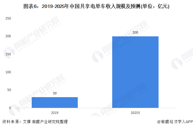 2019年中国共享电单车收入规模达30亿元。随着共享电单车投放规模持续扩大,同时大众共享出行意识的提升进一步推高共享电单车的日常使用率,预计2025年共享电单车收入规模将超过200亿元。艾媒咨询分析师认为,共享电单车作为两轮出行工具的重要补充,市场价值有望进一步释放。
