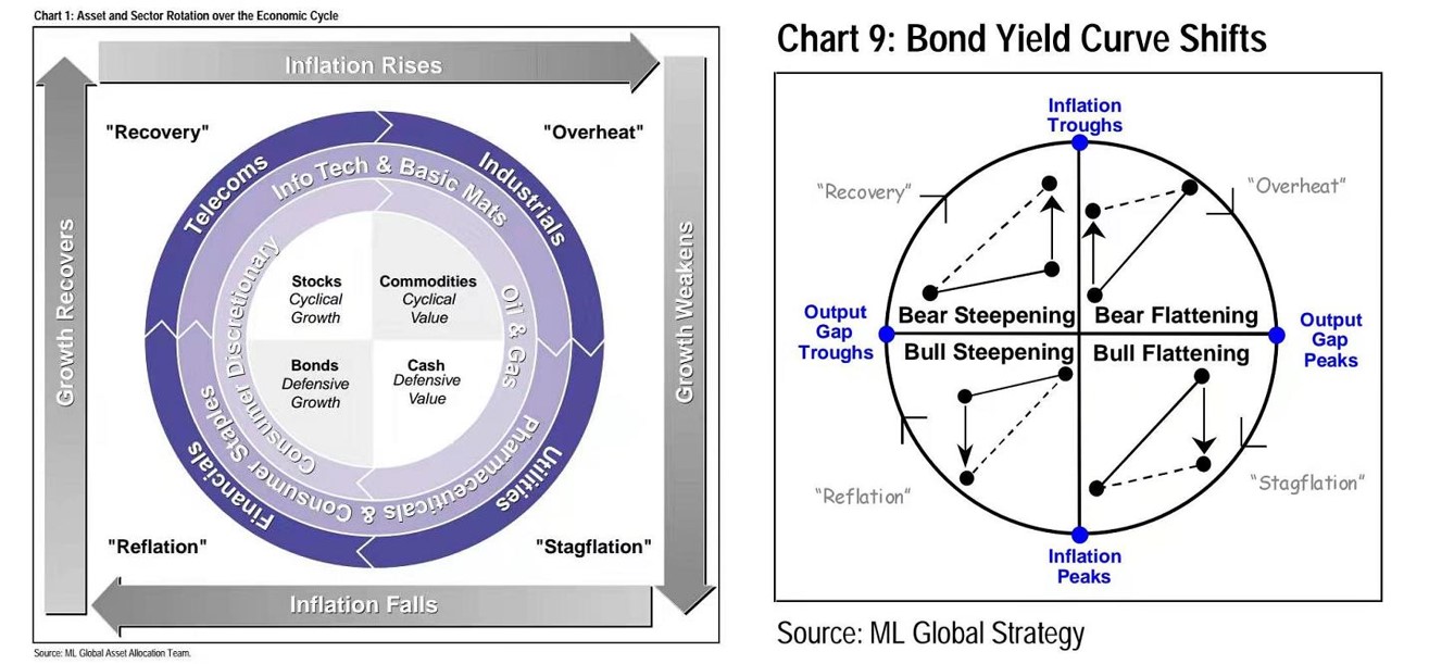 更为难能可贵的是,投资时钟对于固定收益市场收益率曲线在不同阶段的变化也进行了总结。提炼出Bear Steepening(熊陡),Bear Flattening(熊平),Bull Steepening(牛陡),Bull Flattening(牛平)四种收益率曲线的形状。由收益率曲线也能判知周期的变化。这些总结至今仍然是目前宏观分析师们不可替代的分析工具。