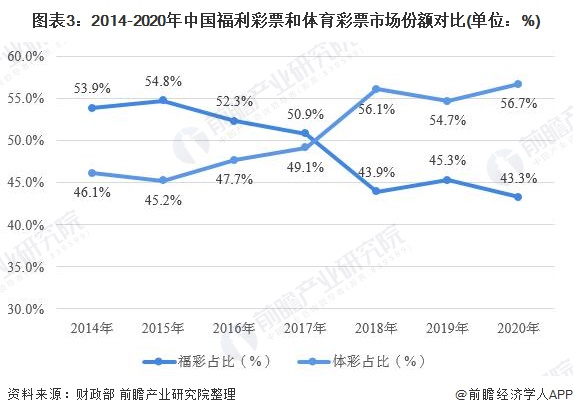 近年来,随着我国体育事业的快速发展,体育彩票的消费越来越受到消费者的喜爱,2018年,我国体育彩票市场份额首次超过福利彩票。2019-2020年,我国体彩增长速度虽有所放缓,但仍保持领先优势,继续反超福利彩票势头。