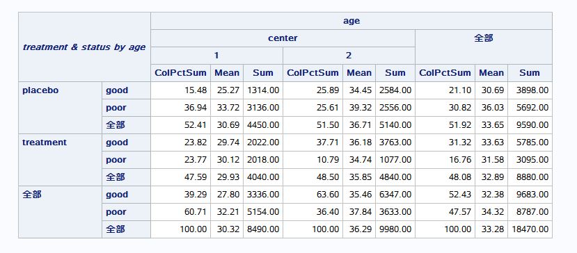 TABLE (treatment='' ALL)*(status='' ALL) ,AGE='age'*(CENTER ALL)*(colpctsum mean sum)