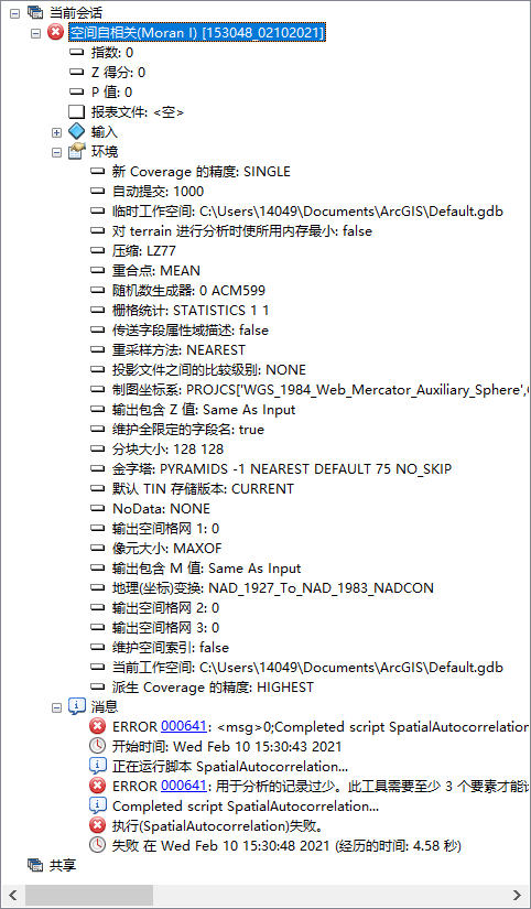 本人arcgis小白,现欲使用arcgis进行空间自相关分析,但却提示失败,情况如下图1: