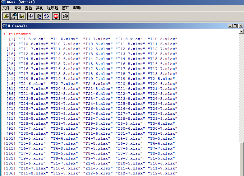 实例:一批实验包含248个样品,检测样品,得到t1-5.xlsx,t1-6.xlsx,t1-7.xlsx........等共248个表格,每个excel文件中包含一个样品的结果,其中还有部分仪器和参数信息。需要从每个文件中提取实验数据。可以用R对excel进行批处理。代码如下:
