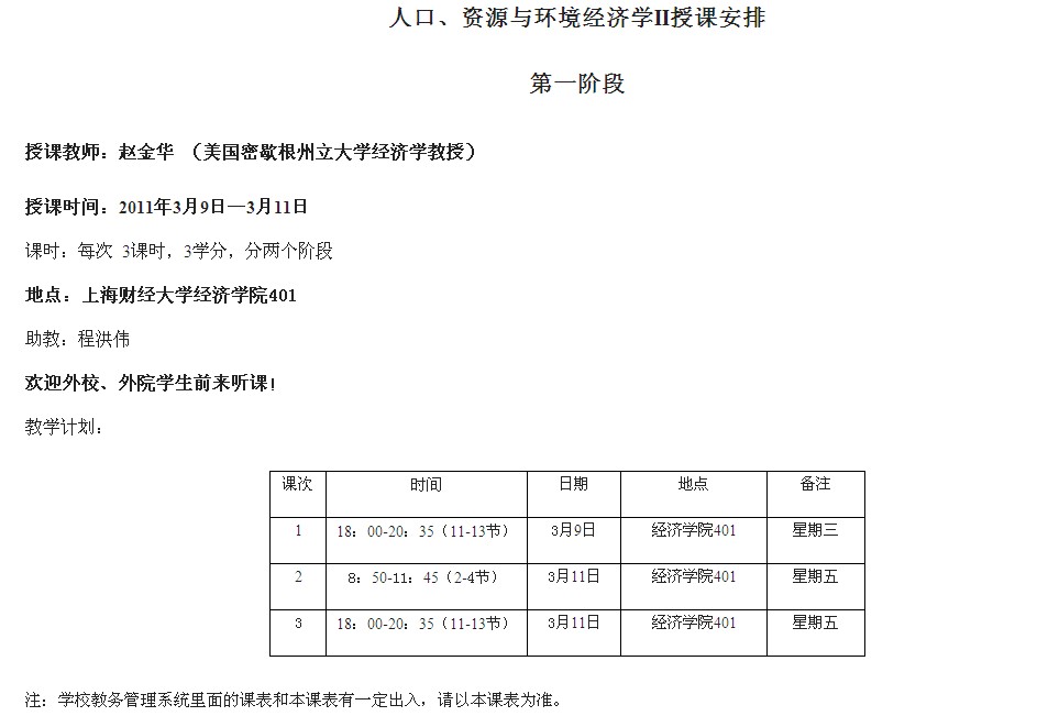 人口、资源与环境经济学II授课安排(美国密歇根州立大学经济学教授授课)