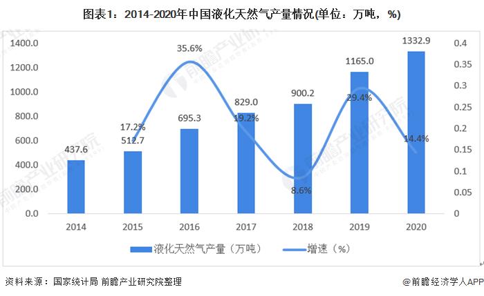 2014-2020年期间我国液化天然气产量整体呈逐年增长态势。2020年我国液化天然气产量为1332.9万吨,同比增长14.4%。