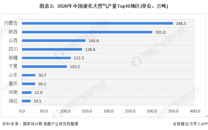 2020年我国液化天然气产区主要为内蒙古、陕西地区等,内蒙古、陕西产量分别为348.5万吨和301.0万吨