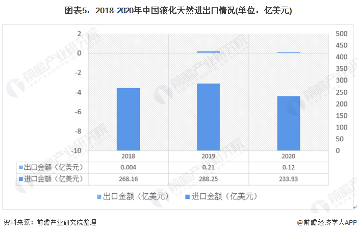 我国液化天然气进口金额远大于出口金额,2020年进口金额为233.93亿美元