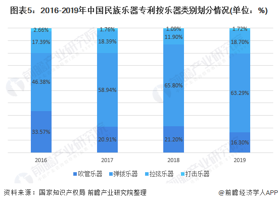 按民族乐器各类别划分,弹拨乐器专利发布数量列居首位,且2016-2019年占比总体呈上升趋势,2019年弹拨乐器专利数量达369项,占比63.29%;其次为拉弦乐器和吹管乐器,2019年专利数量分别为109项和95项,分别占民族乐器专利18.7%和16.3%;打击乐器专利数量较少,2016-2019年占比均在3%以内。