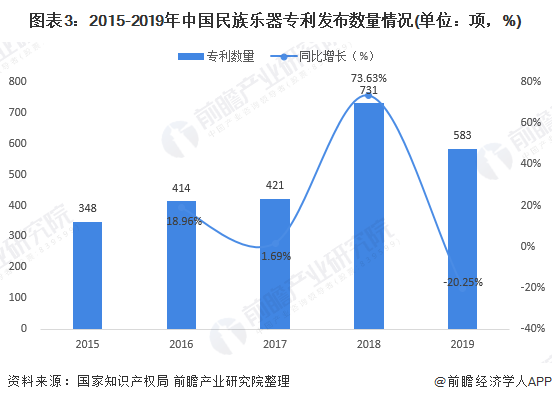 2015-2019年,中国民族乐器专利发布数量呈波动变化趋势,2018年达到峰值731件,2019年有所下滑。根据国家知识产权局专利资料显示,2019年民族乐器专利发布共计583项,同比下降20.25%。