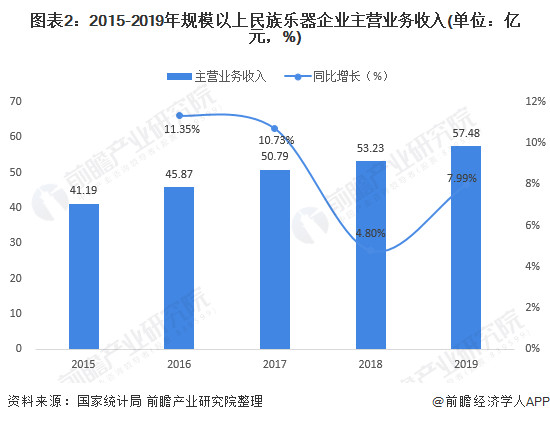 近年来,随着我国经济实力不断增强,百姓生活水平不断提高,国家对传统文化高度重视,民族音乐表演培训市场日益火爆,民族乐器的需求量出现大幅度增长。从规上企业收入来看,2015-2019年,规模以上民族乐器企业主营业务收入逐年上升。2019年,规模以上民族乐器企业累计完成主营业务收入57.48亿元,同比增长7.99%。