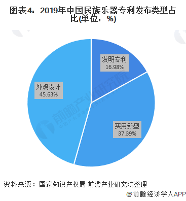 2019年民族乐器专利中,发明专利99项,同比下降17.50%,占全部专利的16.98%;实用新型专利218项,同比下降19.56%,占全部专利37.39%;外观设计专利266项,同比下降21.76%,占全部专利的45.63%。