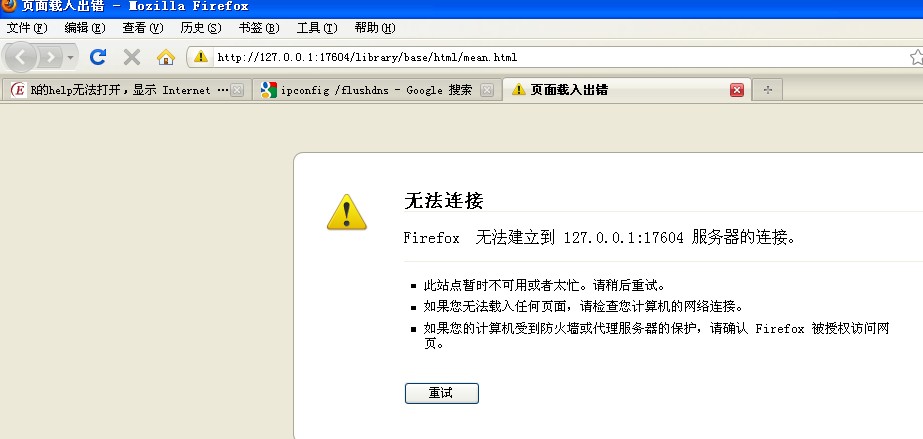 johnmy 发表于 2011-3-5 18:47 例如输入: > help(mean) 打开IE后,显示 Internet Explorer 无法显示该页面 用的是win xp sp3 IE 8 R 2.12.2 请问如何解决,谢谢了。