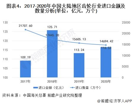 根据海关总署公布的“齿轮及齿轮传动装置,但单独进口或进口的带齿的轮、链轮及其他传动元件除外;滚珠或滚子螺杆传动装置;齿轮箱及其他变速装置,包括扭矩变换器”(税则号:848340)进口数据,2017-2020年中国齿轮产品进口金额呈现波动变化趋势,进口数量逐年下降,2020年齿轮产品进口金额为116.53亿元,进口数量为14694.42万个。