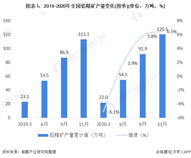 铅行业上游中,炼铅原料主要为硫化铅精矿和少量块矿。根据国家统计局数据,2020年1-11月国内铅精矿产量累计为120.5万吨,同比上升6.5%。我国铅精矿产量占全球近一半,但储量仅占全球20%,与其他金属一样,中国铅资源存在过度开采利用的问题。国家可能进一步控制铅精矿开采。