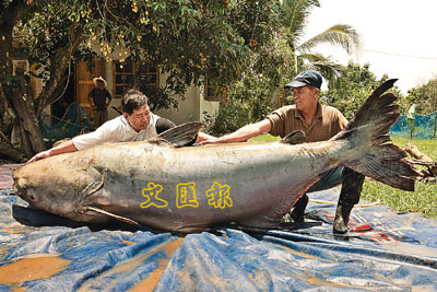 该尾身长2.7米的泰国湄公巨鲶,亦是泰国有记录以来所捕捉到的最大淡水鱼。捉到这条鱼的渔民原先想把它卖给环保人士,但环保人士并未购买,