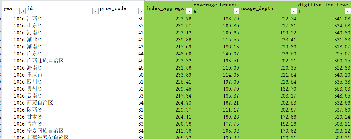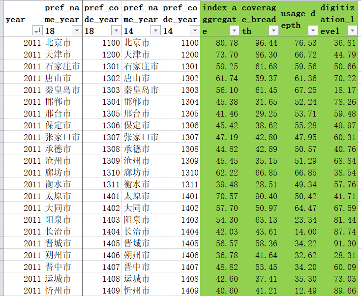 3、指数属性:这套指数包括数字普惠金融指数,以及数字金融覆盖广度、数字金融使用深度以及普惠金融数字化程度;此外使用深度指数中还包含支付、信贷、保险、信用、投资、货币基金等业务分类指数。 |