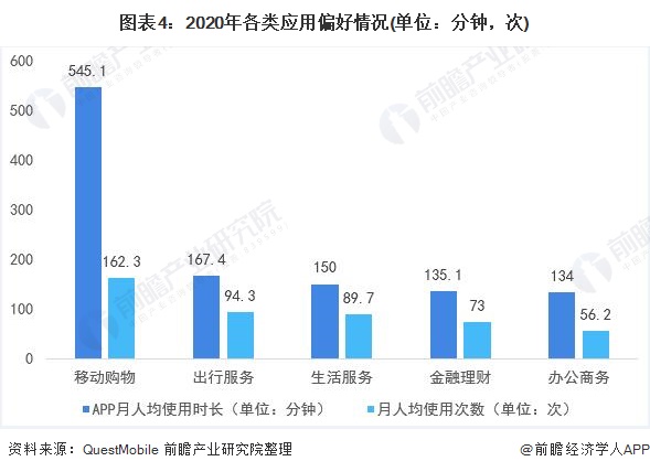 从APP用户人均日使用时长来看,随着线下生活场景的线上化转移,用户的使用程度也在不断加深2020年12月,从APP月均使用时长和使用次数来看,移动购物排行前列,月均使用时长和次数分别为545.1分钟和162.3次。