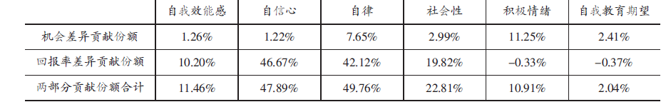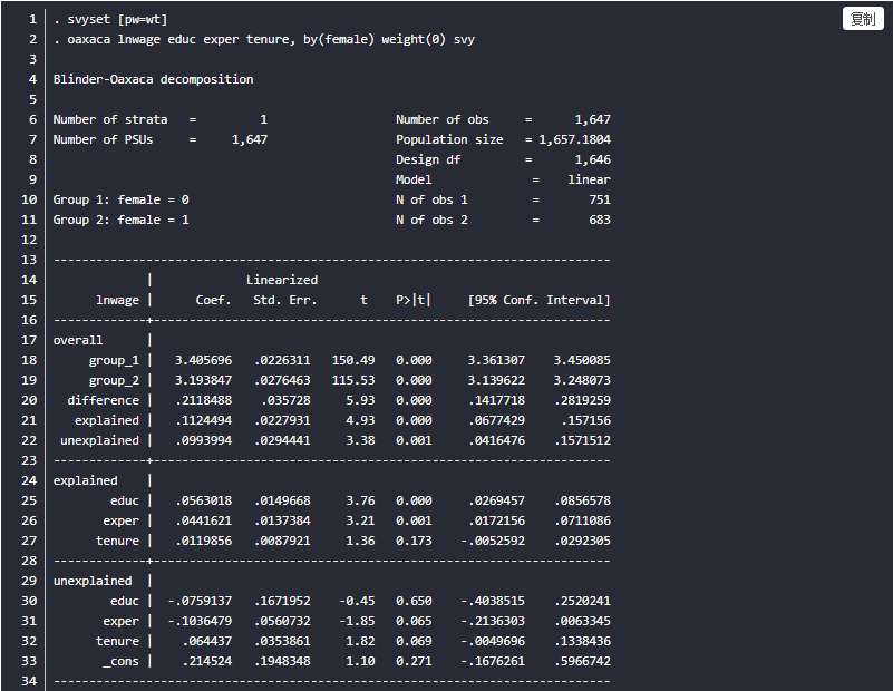 在中国知网上看到一篇论文中用Blinder-Oaxaca 分解计算了机会差异贡献份额、回报差异贡献份额,但是我按照网络上Blinder-Oaxaca 分解的命令只能获得这个结果,有哪个大佬可以解答一下吗?