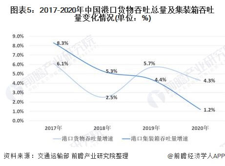 2020年,全国港口完成货物吞吐量145.5亿吨,同比增长4.3%;内、外贸吞吐量分别完成100.5亿吨和45.0亿吨,同比分别增长4.4%和4.0%;完成集装箱吞吐量2.6亿标箱,同比增长1.2%。国内港口货物吞吐量相对保持较高的增长态势。