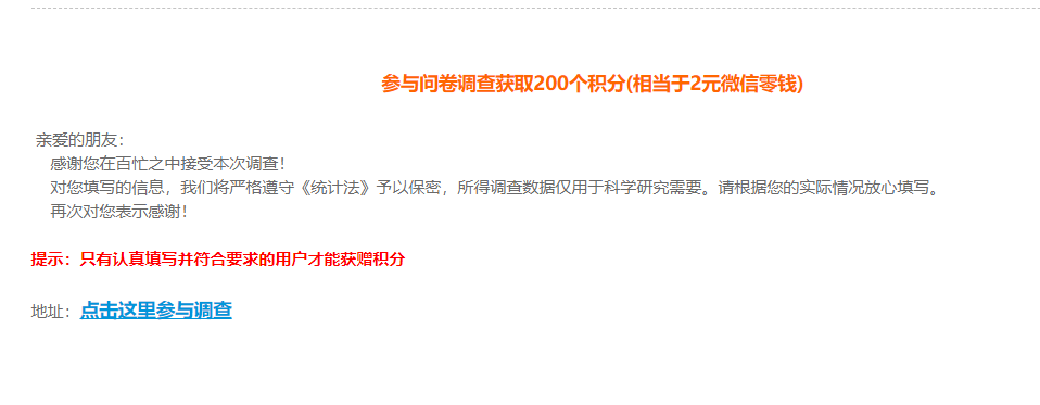 填写问卷前,请仔细阅读以下:“双非”类院校大学生知识付费情况调研,本调研共29道题目,答题时间5分钟左右,请大家认真填写,不要重复填写!(后台可查ip)。如果参与的话,楼主会立即支付60论坛币,本人常驻论坛里。 麻烦各位大佬点击以下问卷链接: