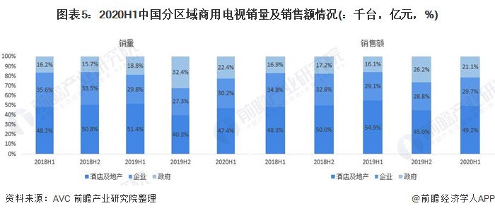 我国商用电视行业近年来发展迅速。但是,2020年受到疫情的影响,上半年我国商用电视销量和销售额均呈现下滑趋势,其中华东地区需求下滑最大。不过,医疗、广电(搭建线上教育)需求扩大带动了大尺寸商用电视的需求。政府项目收紧导致其市场份额被酒店及地产、企业所积压。