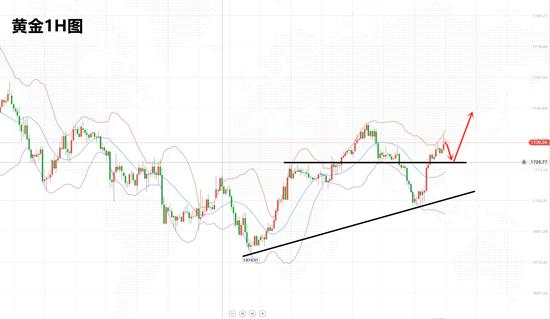 从盘面上来看,金价近几日实际上是一个大的震荡,日K线总是实体部分小,影线部分长,做多放空均缺乏延续性。4小时K线介乎两条均线MA100和MA60之间运行,三连阳之后收阴,眼看要冲破前高,实际上多头还是缺乏连续性。小时线布林线整体仍然向上运行,均线支撑K线向上延伸。所以,黄金午后回落踩中轨1720附近仍是做多机会。操作上我们不要贸然转空,今日操作按照震荡操作思路进行,不追涨,不杀跌。