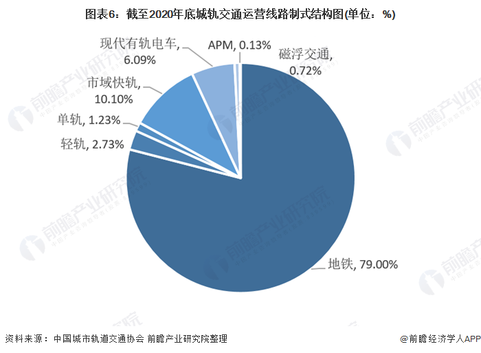 截至2020年底,我国城轨交通运营线路长度方面,地铁占比79%,占主导地位,占有率较上年有所上升;市域快轨占比10.10%;现代有轨电车占比6.09%;轻轨占比2.73%;可以看出我国城轨交通发展仍然走的是以地铁为主导,多种线路协同发展的方向。