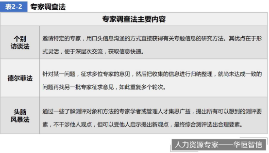 在明白了指标测评指标的内容后,我们需要了解一些制定测评要素的方法,在这里向大家介绍三种主要方法:工作分析法、专家调查法、胜任特征分析法。