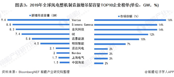 目前,我国以金风科技、远景能源、明阳智能等为代表的风电整机制造商技术已经基本达到国际平均水平。据BloombergNEF数据显示,2019年我国共有6家中国企业进入全球风电新增装机容量前十榜单。其中,金风科技排名第三,仅次于丹麦企业Vestas和西班牙企业Siemens Gamesa。其它入榜中国企业还包括远景能源、明阳智能、运达风电、上海电气和中国海装。