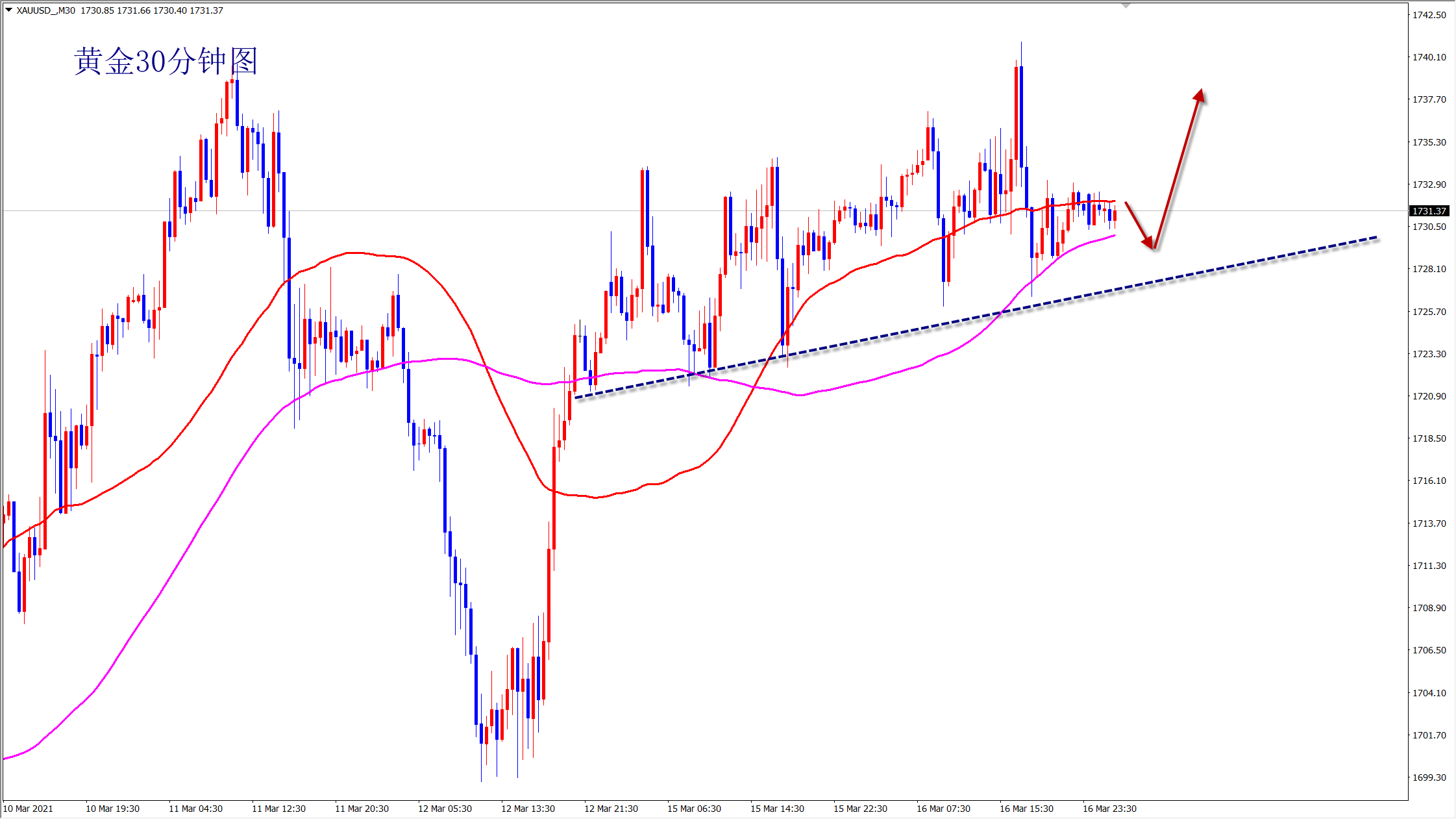 黄金当前属于震荡慢涨的走势,每次新高后都会出现大阴杀跌的情况,但是每次下跌的低点都会高于上一次回调的低点,没有破位点连线的情况下,我们还是维持回踩低多的策略不变!早盘依托1727的支撑继续看涨!