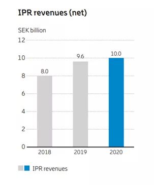 下图是爱立信2020年的财报,IPR(知识产权)收入为100亿瑞典克朗,按照今天(3月16日)的汇率就是差不多12亿美元,占爱立信2020年收入的4.3%。