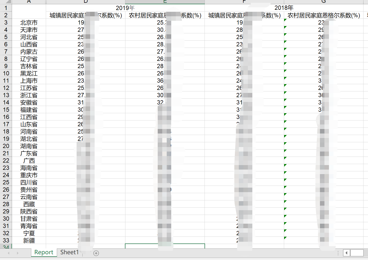 31个省市各省份城镇居民恩格尔系数农村居民恩格尔系数