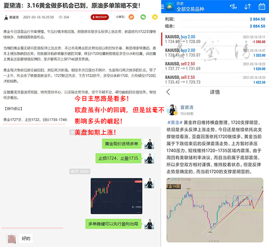 周二黄金走势正对黛清的思路,亚盘黛清通知学员1734进场空单,止损位给到1728,空单止损出局。欧盘黄金再次回调1728位置,给到我们多单进场的机会。黛清1728通知学员进场多单,在1731位置手动止盈出局。美盘黛清通知学员1737位置进场空单,在1731位置手动止盈出局。1735位置通知学员再次进场空单,在1729位置手动止盈出局。整体是盈利的!方法不对,努力白费,方法找对,事半功倍,凡事皆有法,找到好方法是成功的一半。不是题没答案,只是没找到方法,也不是路已到尽头,是该转弯了。